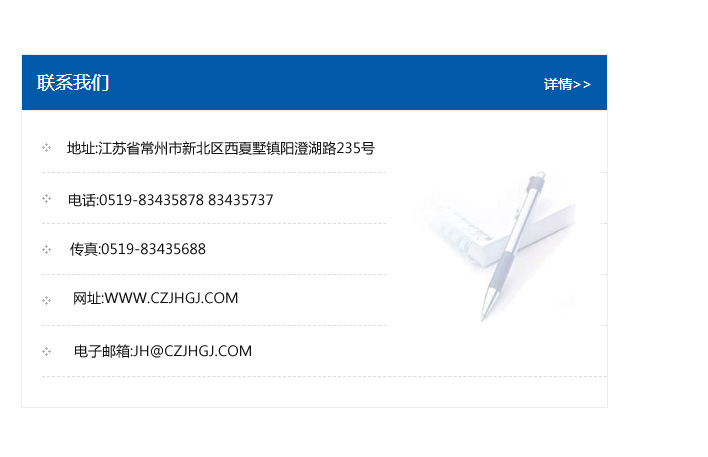 地址:常州市新北區友邦商務大廈1幢16、17層  電話:0519-85101652  傳真:0519-85112595  郵編:213022  網址:www_cz-jiayue_cn.dongyizh.com  郵箱:xiajifengaa@163.com